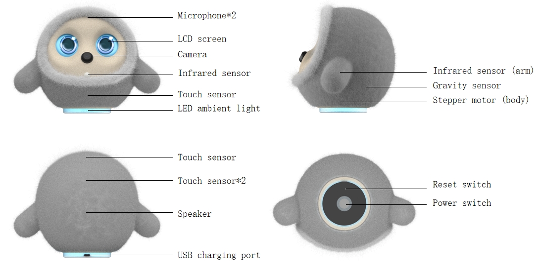 | LCD uttrykksskjerm | 4,28-tommers LCD-skjerm (øyne), støtter dynamisk uttrykksvisning og kikkertskjerm (som f.eks. visuell tilbakemelding når du "spiller død" eller "oppfører seg søtt"). |